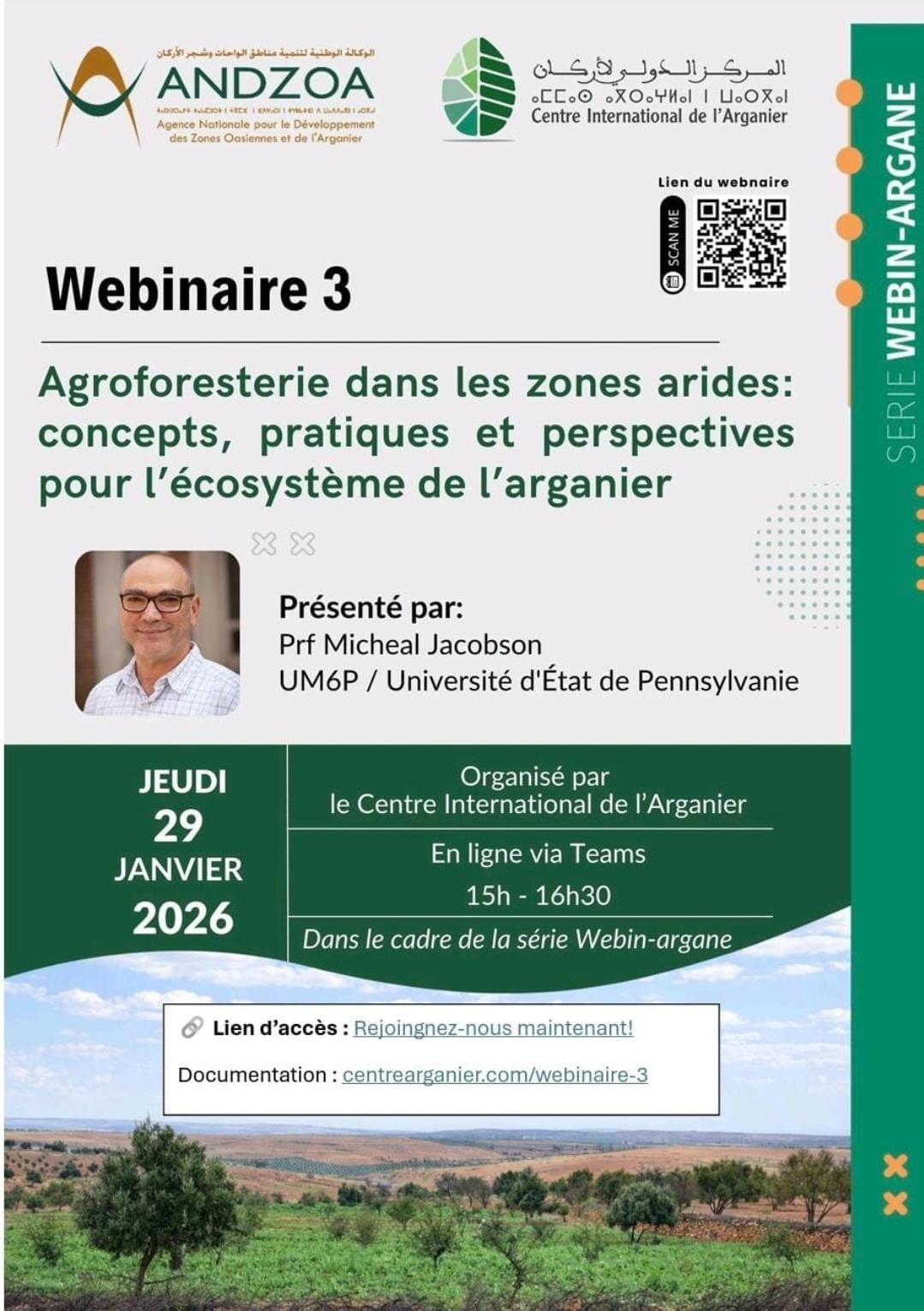 نظم المركز الدولي لأركان، التابع للوكالة الوطنية لتنمية مناطق الواحات وشجر الأركان (ANDZOA)، لقاء علميا يوم الخميس 29 يناير 2026، قدم خلاله الدكتور مايكل جاكوبسون (Michael Jacobson, Ph.D) محاضرة علمية تناولت قضايا الزراعة الغابوية في المناطق الجافة، من حيث المفاهيم والممارسات والآفاق المستقبلية.